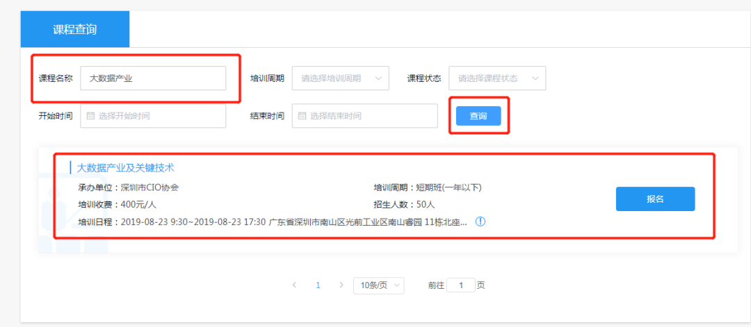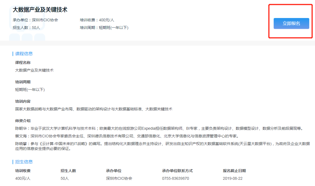 按照操作手册注册登录后,在紧缺人才培训中搜索“大数据产业”,查询后点击“报名”《大数据产业及关键技术培训》,“立即报名”即可,按照提示线下付款后,报名成功。付款后需要开发票的同学可以将开票信息发到联系邮箱,谢谢!